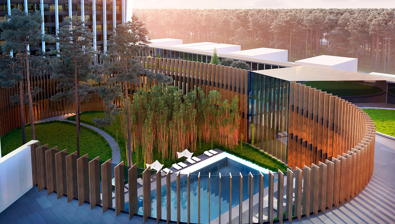 However, not only the exterior's interesting solution is impressed by the architecture of the object. The three-tier stylobate accommodates casino (3,000 m²), two restaurants (2,710 m²), a cafe (835 m²), a sports club and SPA area (a total area of 3 152 m²), a conference room (498 m²), lounge, hotel with technical facilities and underground parking (for 300 cars). In the center of the stylobate in the open atrium there is a large swimming pool around which is a green area with a bamboo grove.