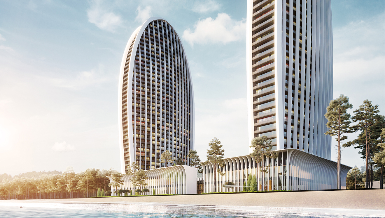 The architectural idea was inspired by nature itself. The image of the two towers resembles a pair of blue whales emerging from the water. Laconic shape and strict white vertical lines emphasize the sophistication of the architecture of the hotel complex.