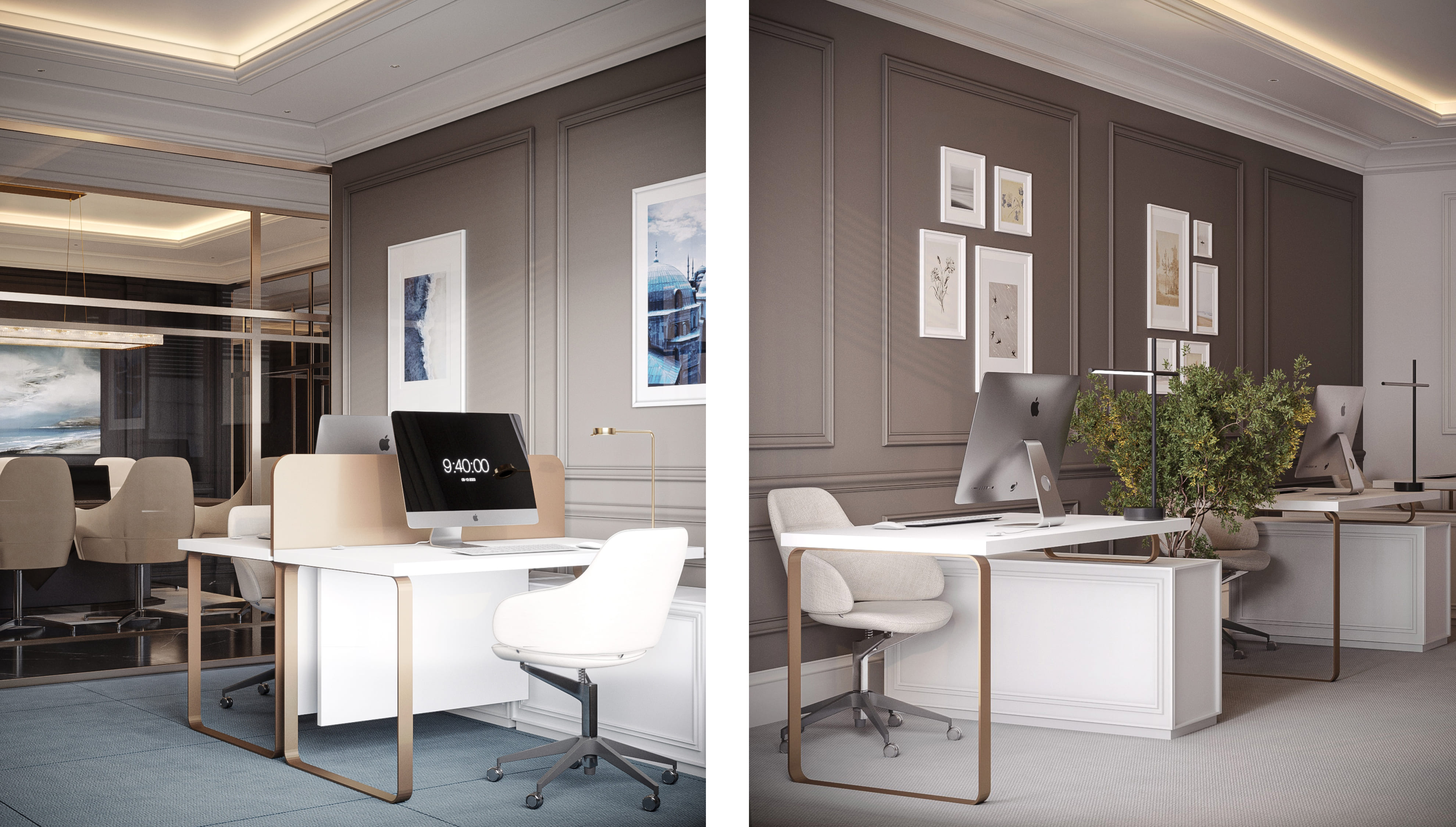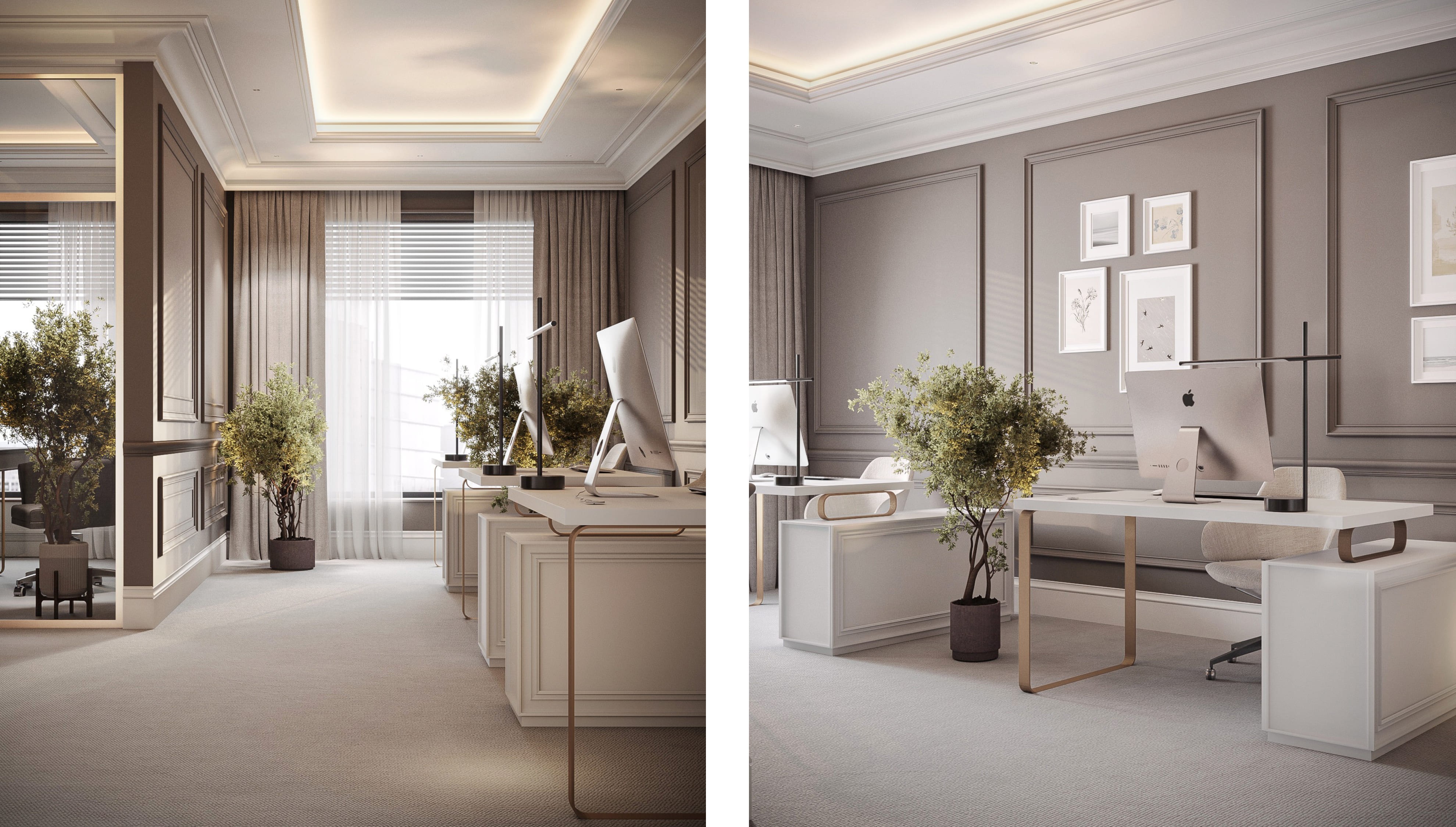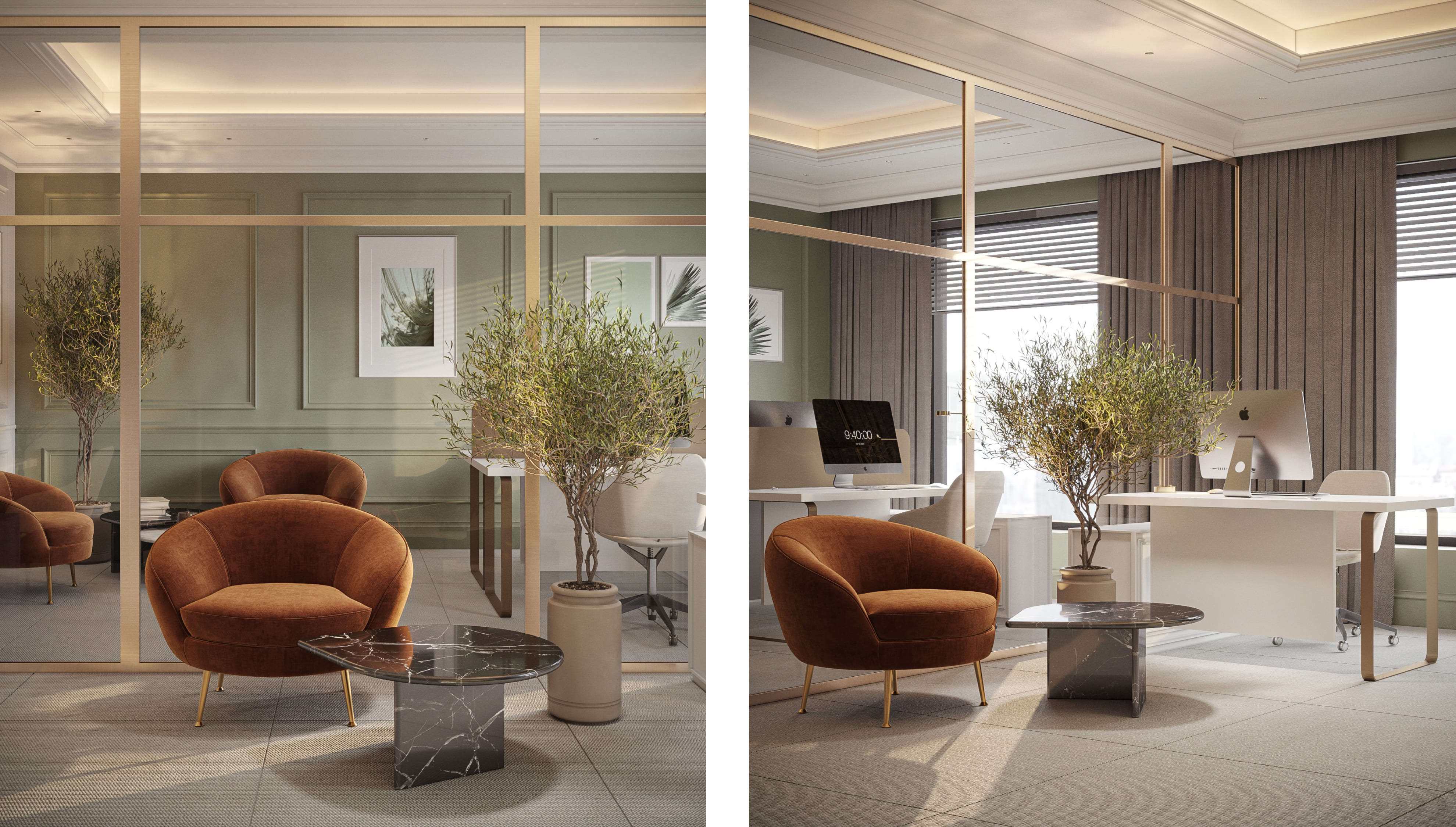 The office design combines elegance and functionality. The interior is made in calm, neutral tones, creating an atmosphere of professionalism and comfort. Natural materials such as wood and marble are used, which emphasizes the status and solidity of the space. Soft furniture lines and green accents bring comfort and harmony, while modern lighting provides soft, cozy light. This office embodies a balance of classic and modern, perfect for productive work.