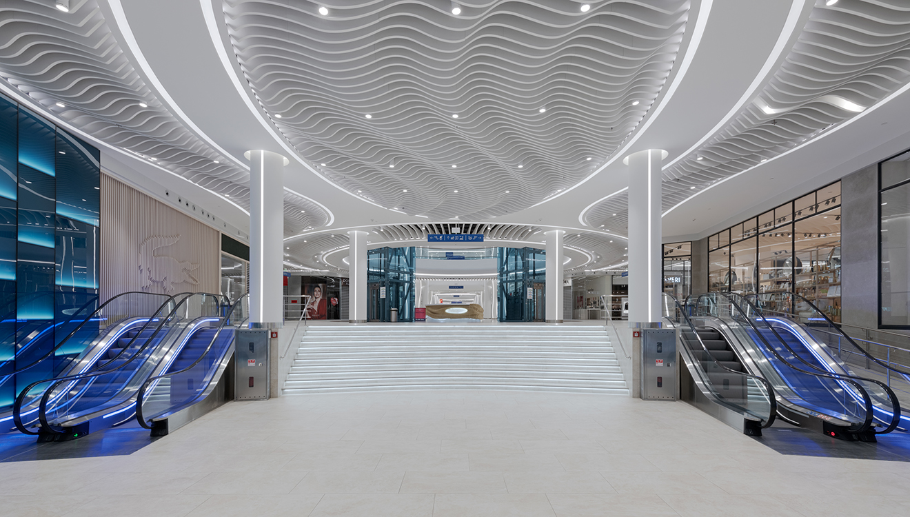 The main idea of the object is reflected in the name and was to be continued in interior design. The theme of water in the River Mall can be traced in every detail of the interior decoration: for its implementation, exquisite materials of natural shades, elements associated with wooden parts of sailboats, as well as hidden artistic lighting were selected.