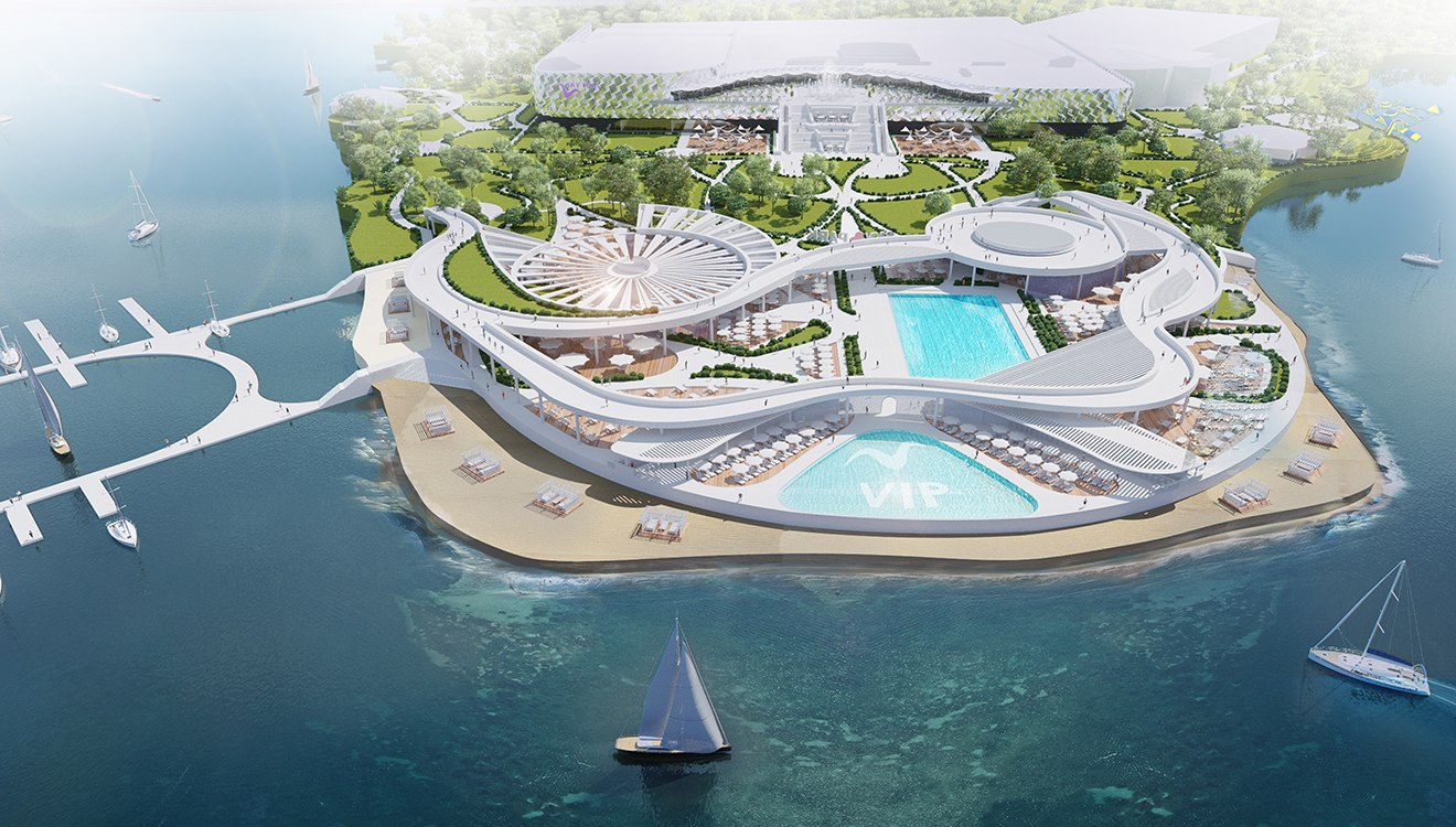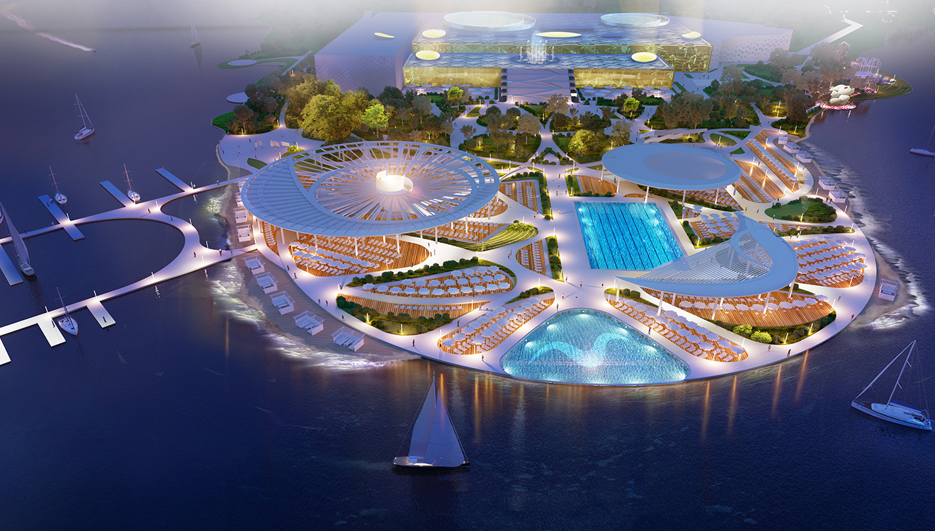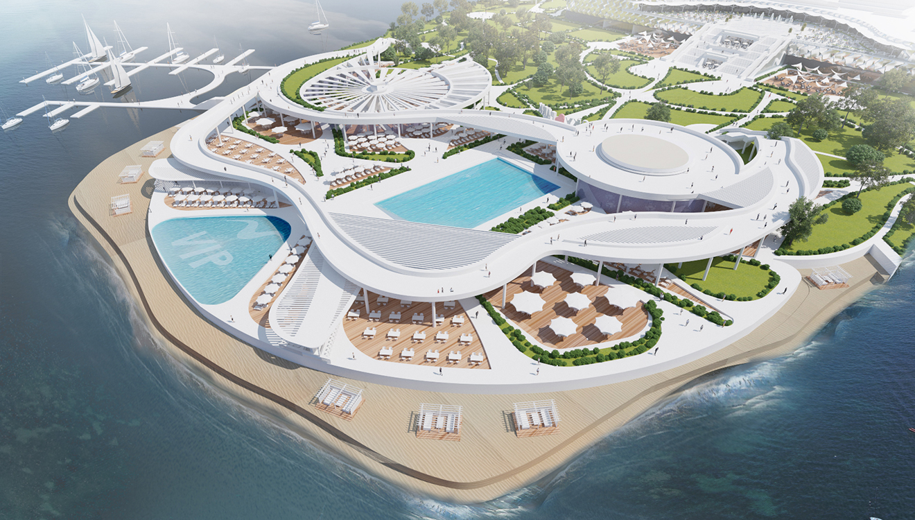 The projected amusement and leisure park is located on the coast and is a modern multifunctional complex. The design focuses on organic forms and flowing lines, harmoniously integrating with the natural surroundings. The central area includes swimming pools and beach areas for VIP guests, emphasizing the prestige of the complex. Around it are restaurants, cafes and recreational areas for visitors of all ages. An important aspect is to maintain a balance between architectural forms and green areas. The main goal of the project is to offer a variety of recreational opportunities for all tastes.