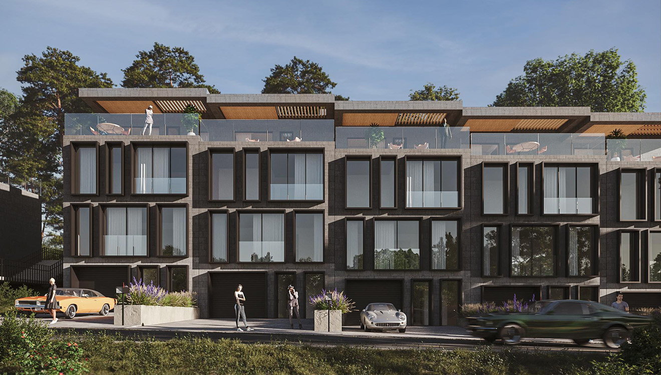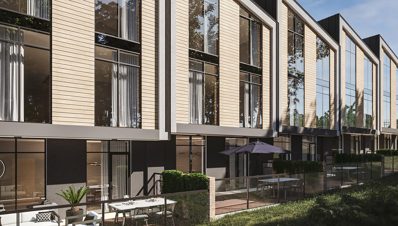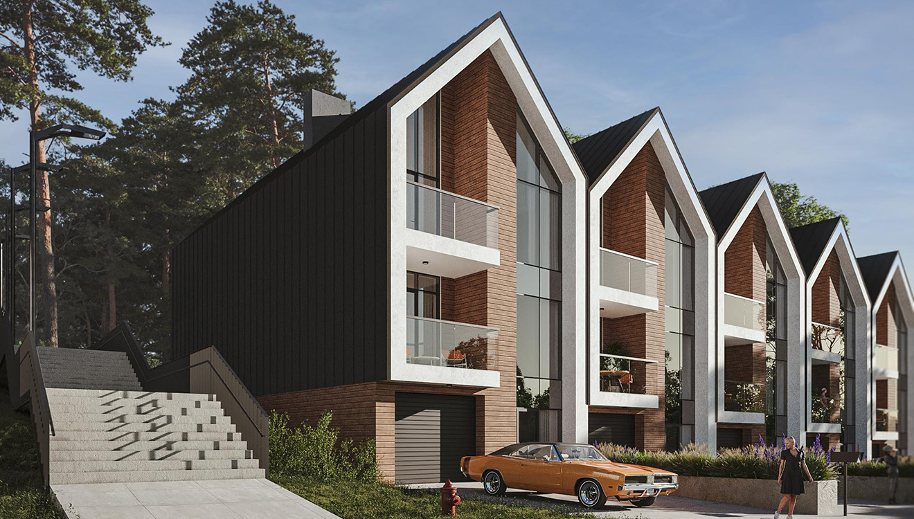 The cottage project is designed in a modern architectural style with an emphasis on functionality and aesthetics. The open terraces, spacious glass facades, and minimalist geometric shapes give a sense of lightness and maximize natural light. The main materials are concrete, glass, and metal, which give the project a modern industrial look. The use of wooden elements creates a balance between the coldness of metal structures and the warmth of natural materials. Each cottage has its own garage on the ground floor, which provides additional convenience for residents. Spacious balconies offer picturesque views, allowing residents to enjoy nature and privacy. The smooth lines and monolithic forms of the buildings harmonize with the surrounding landscape.